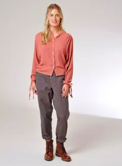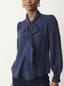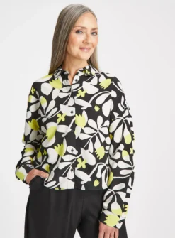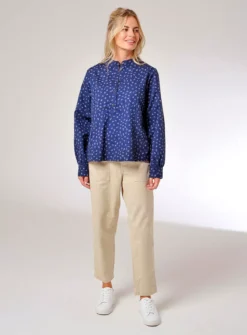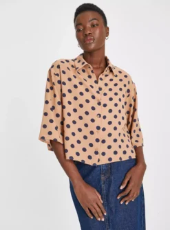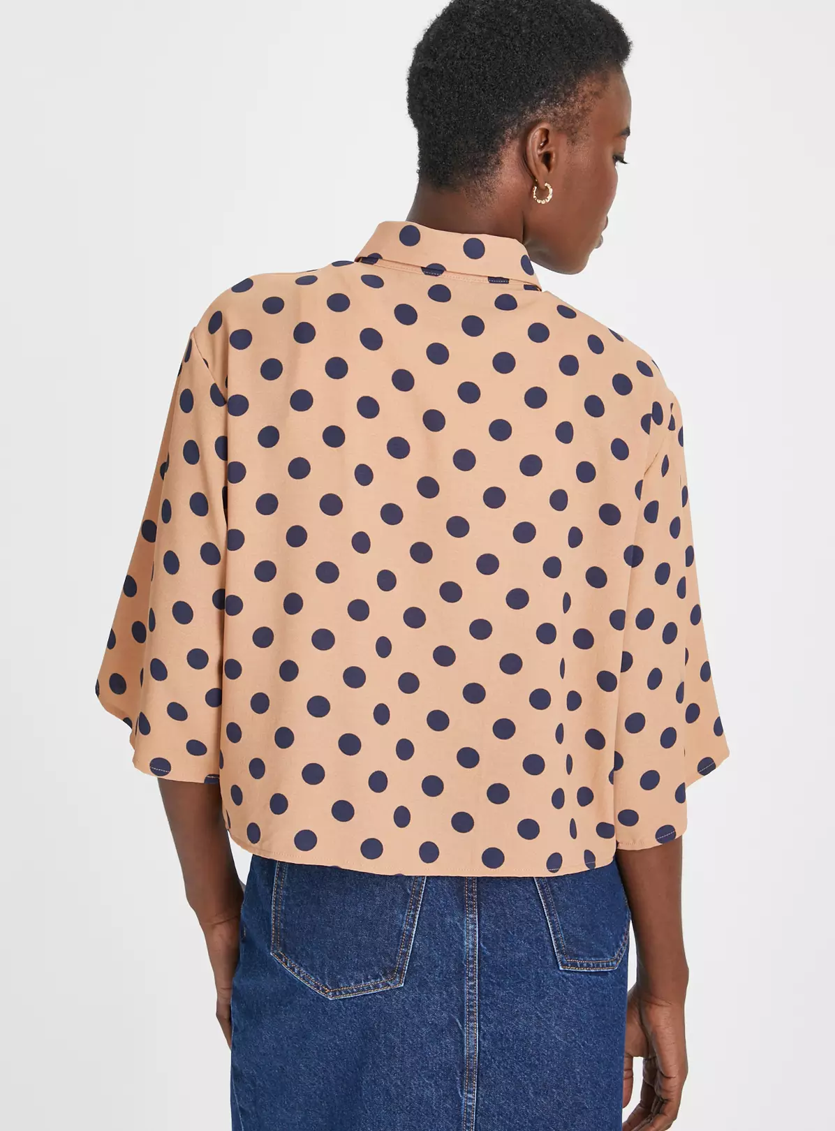 Our beige and navy spot boxy fit shirt is bound to be a hit this season. It features wide sleeves and a value-through front. Team with jeans for a cute weekend combo.