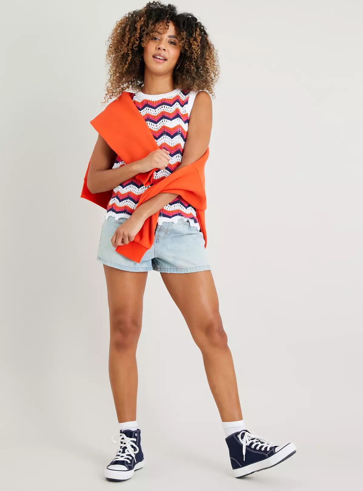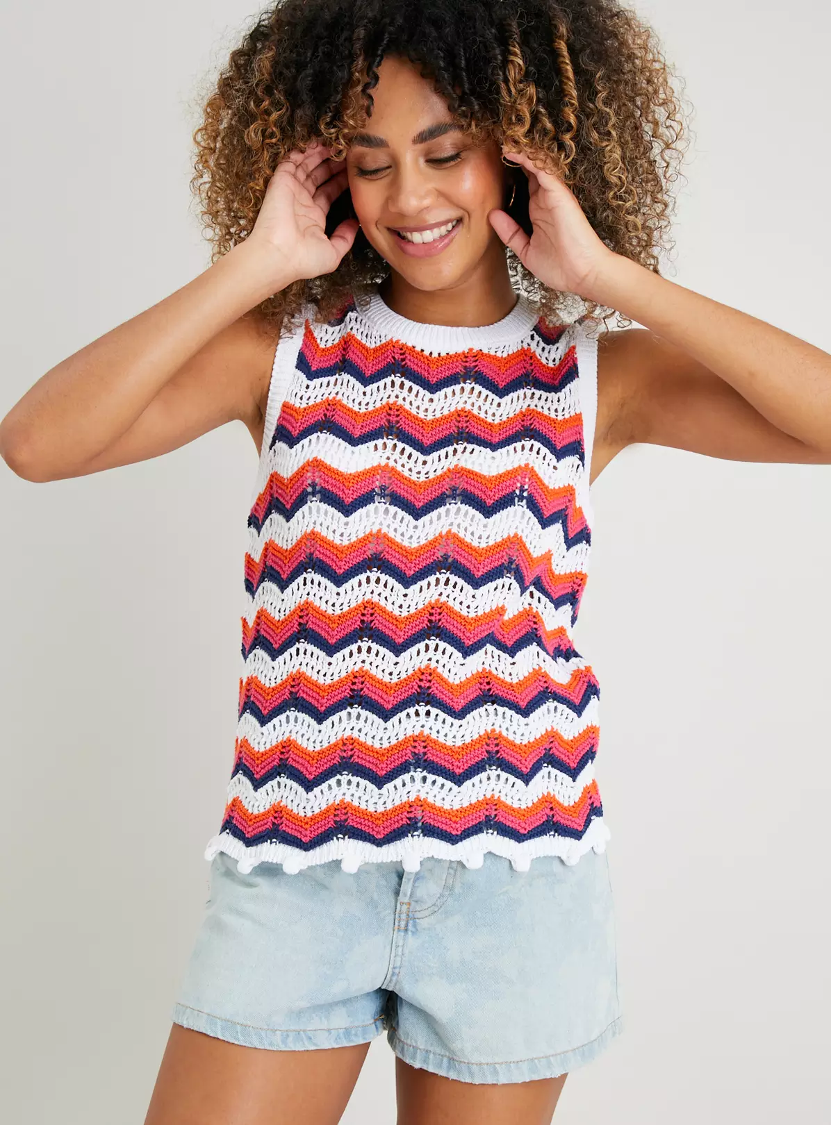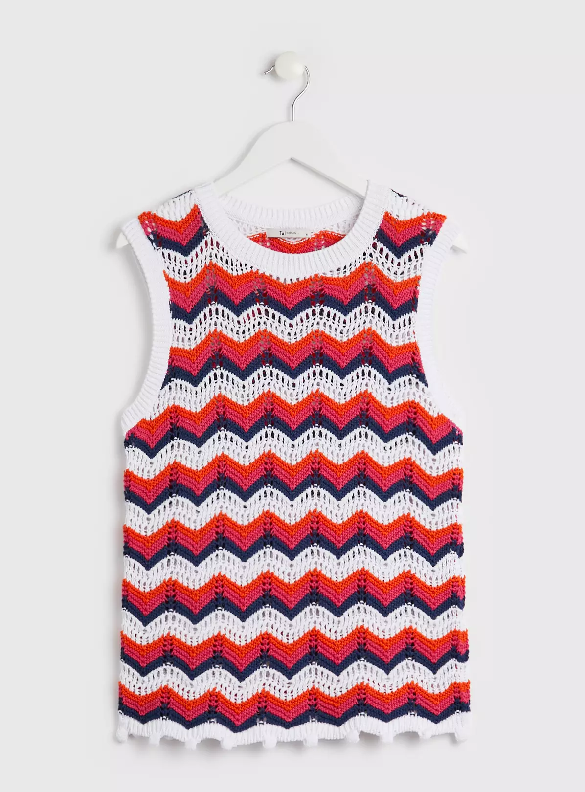 Update your wardrobe with something a little bit different. Our lovely crochet vest top comes in a trendy chevron pattern in red, navy and white. With a round neck and ribbed hems for added style, it looks great paired with a pair of denim jeans!