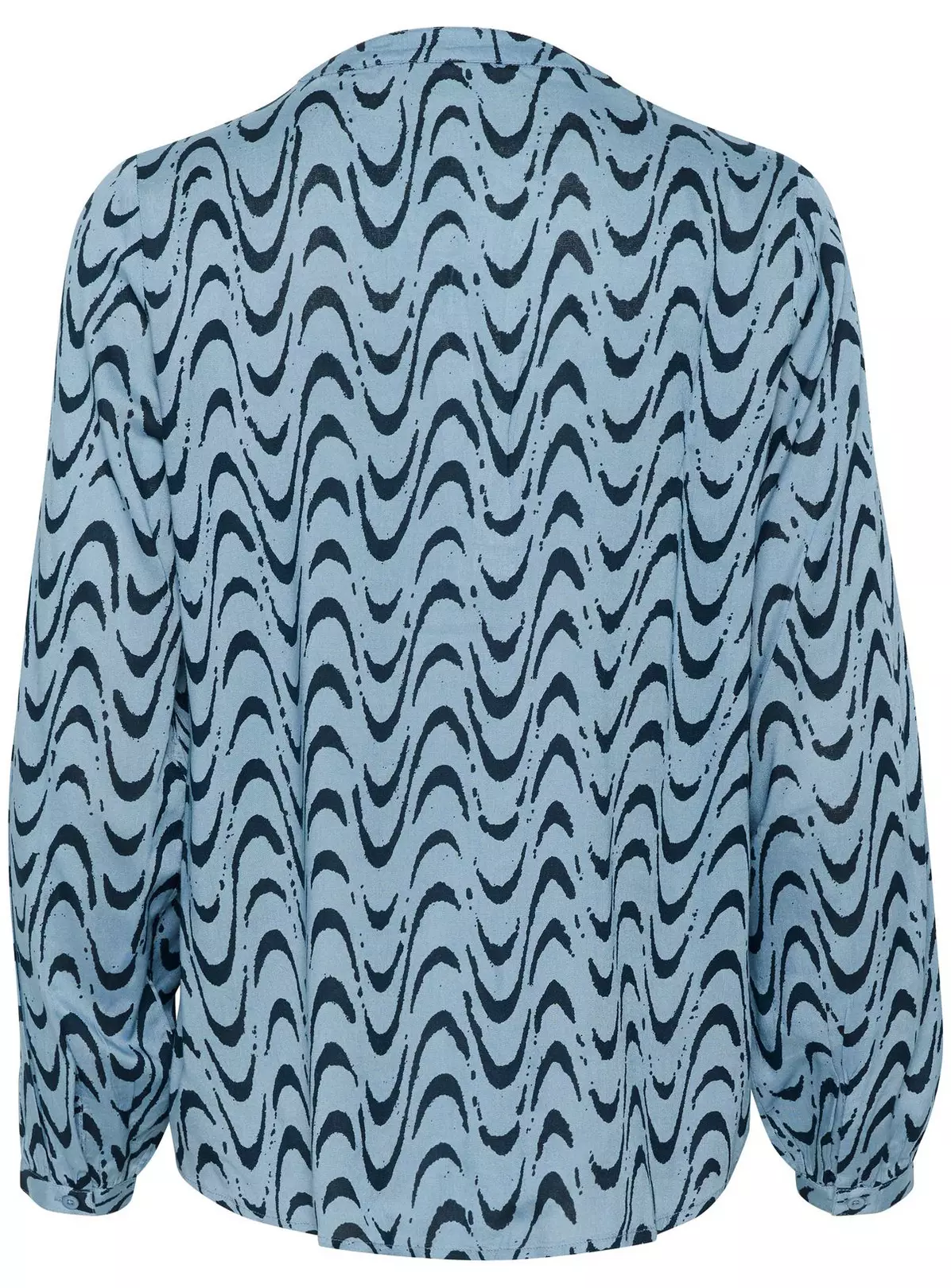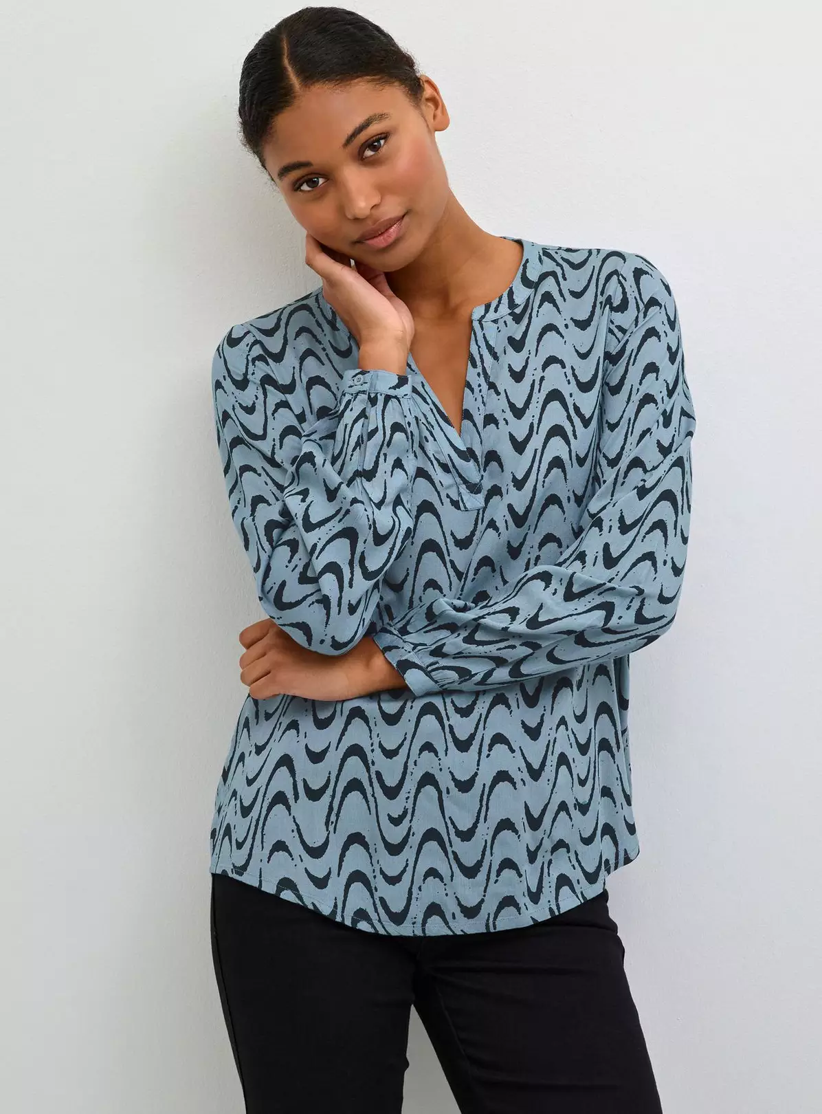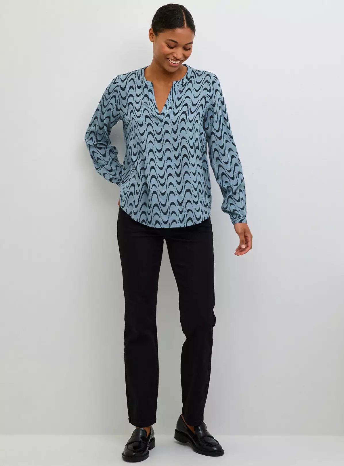 Graphic print Mira Blouse: V-notch neckline, band collar, regular fit. Features long, narrowed value cuff sleeves, hip cut, rounded back hem.