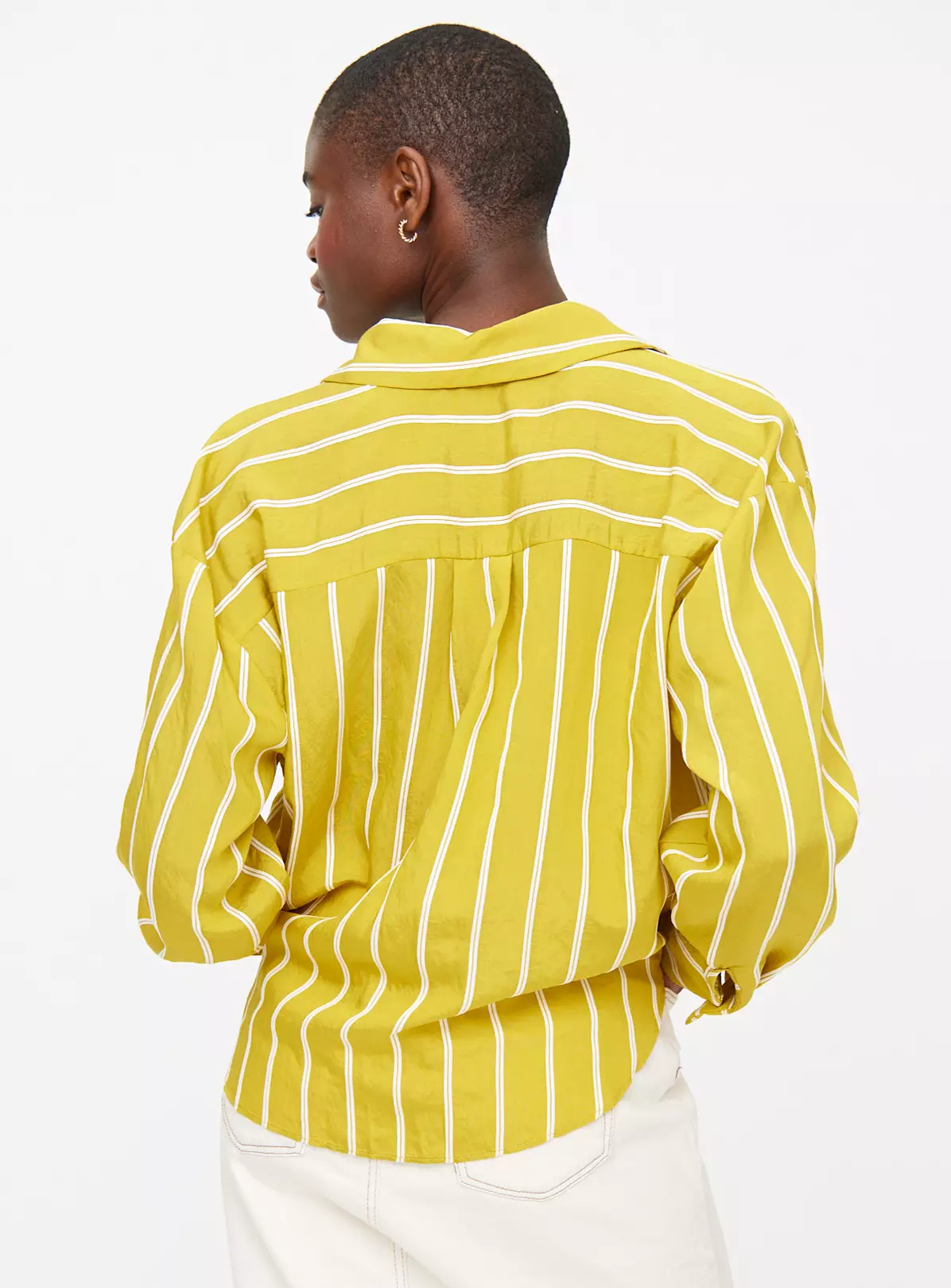 Achieve a modern look with our yellow stripe shirt. It features a flattering twist front detail designed to elevate your weekend outfits. Team it with denim jeans and a pair of slip-on sandals.